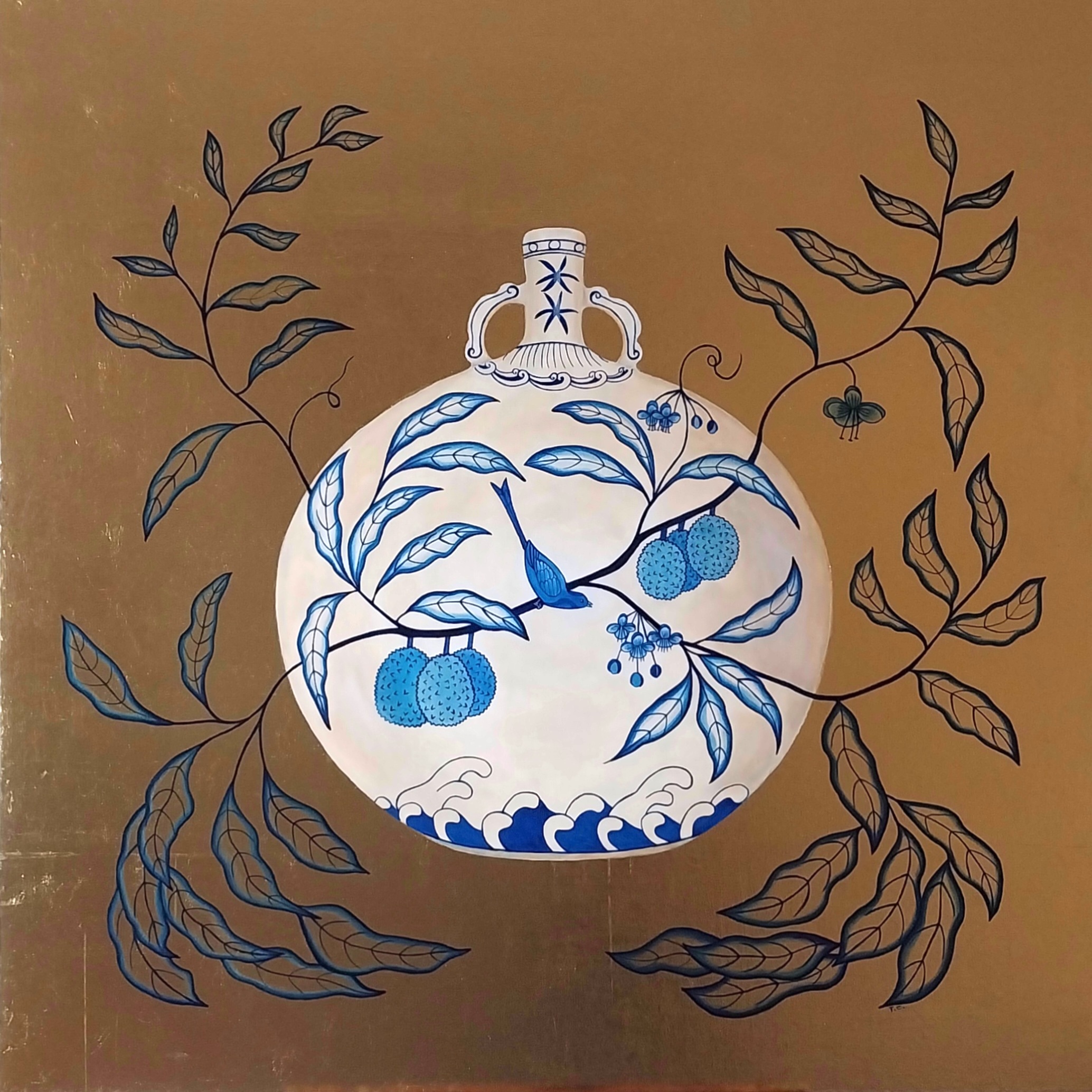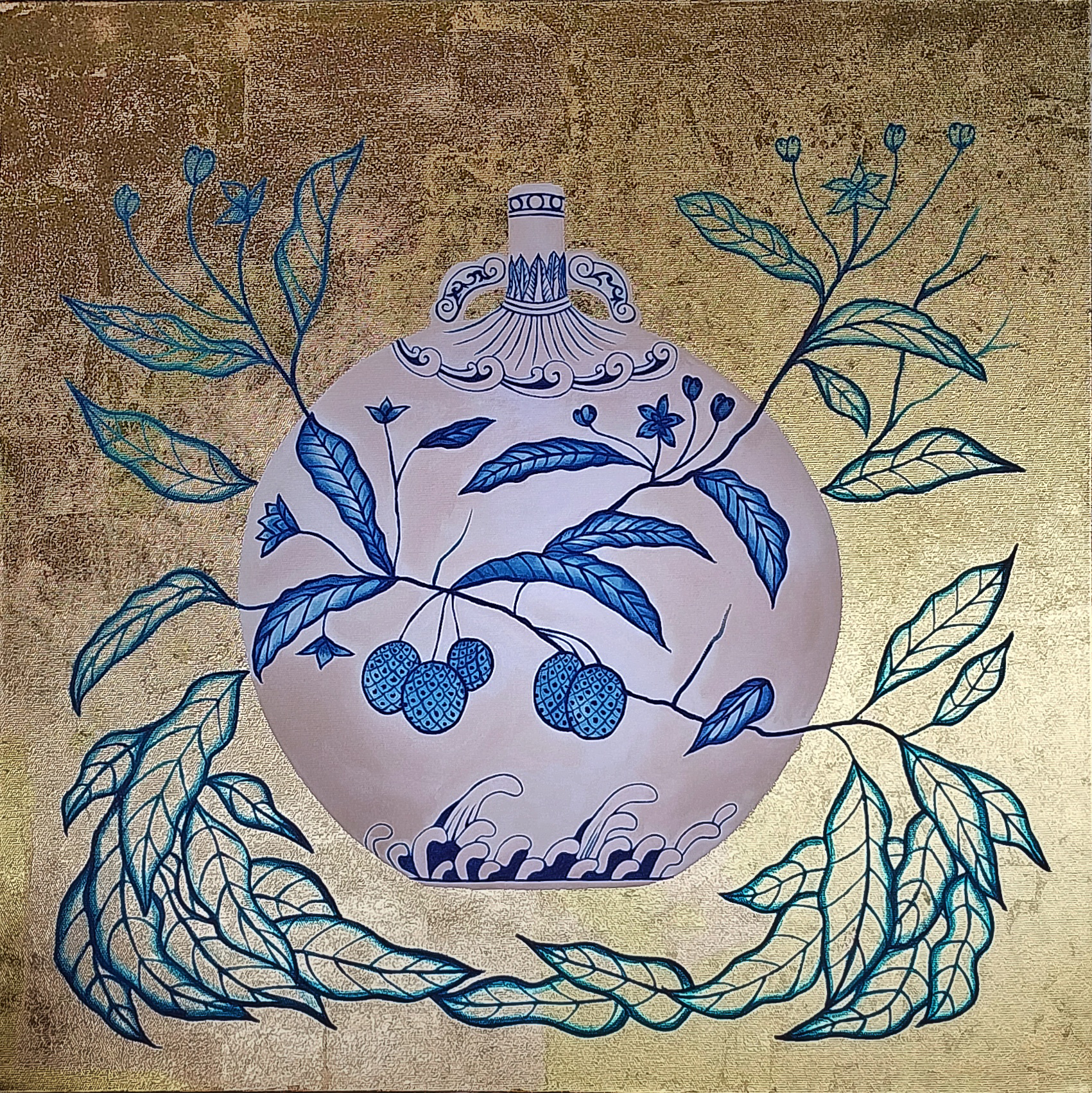 In this series, the motifs of the moon flask grows out of the vase to merge with the background. This visual metaphor represents the union of internal and external worlds, thus a sense of belonging.