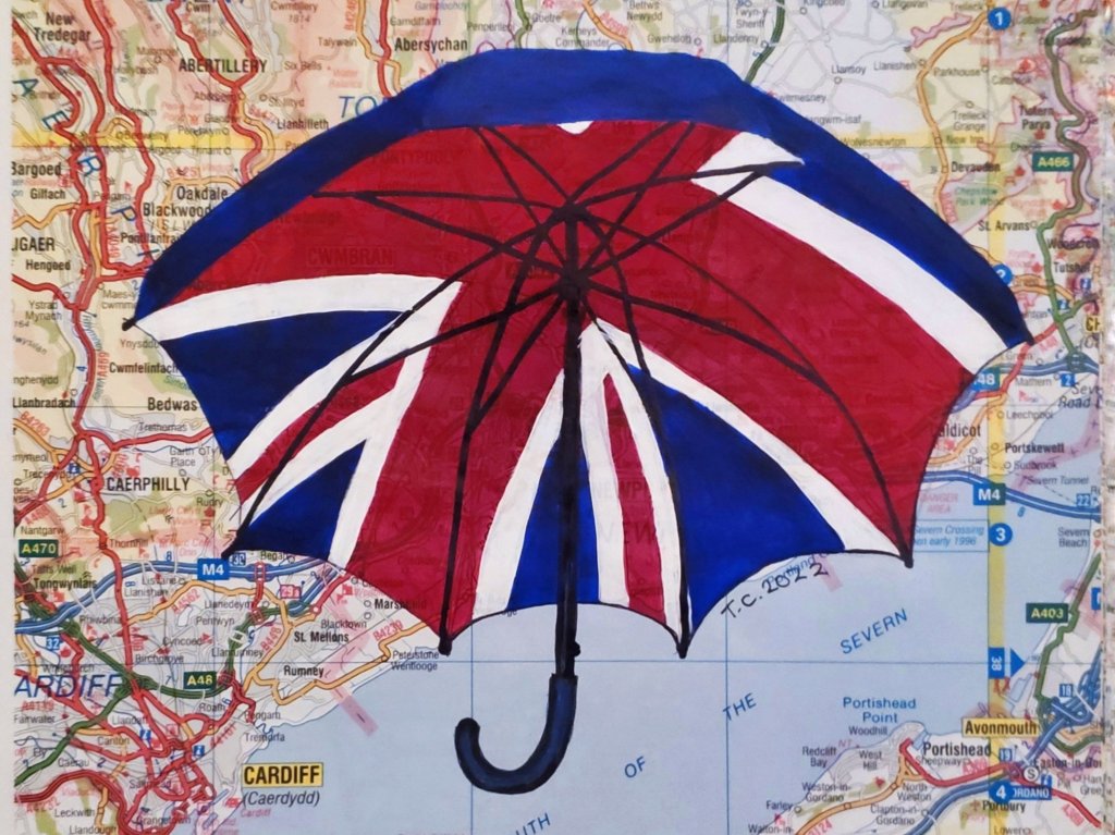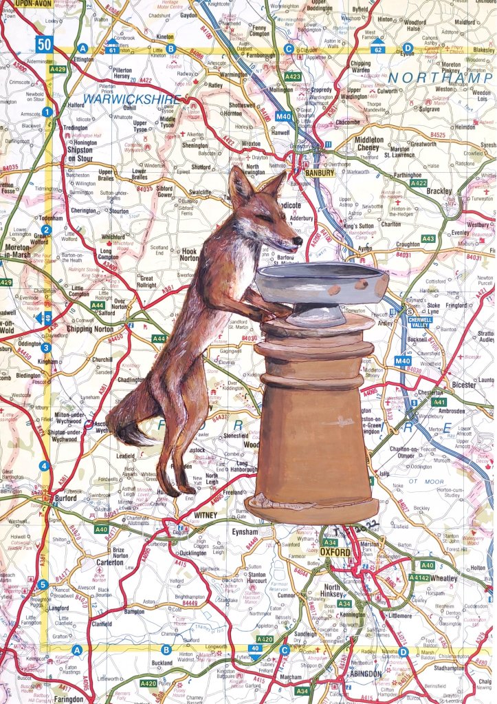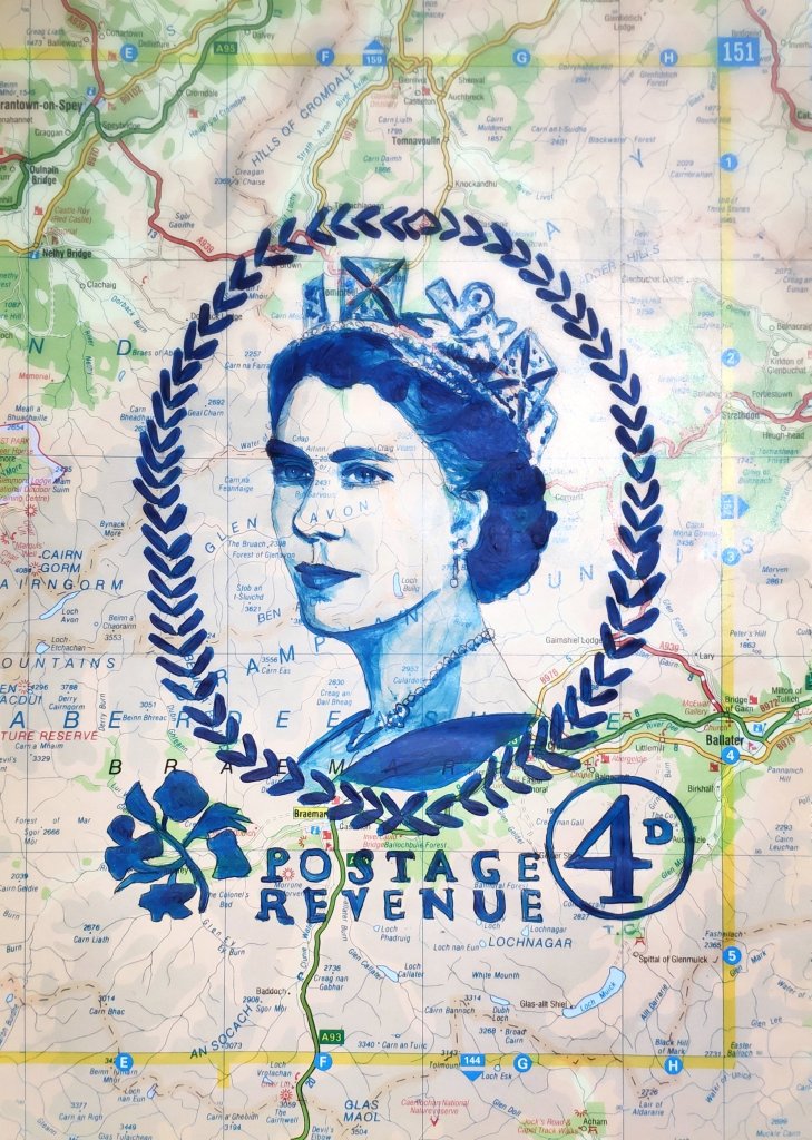 I painted this series in the summer of 2022 in London on old AZ maps in the spirit of celebrating all things quintessentially British. Sadly as I arrived back in Malaysia I heard the news that the Queen passed away. The last painting of the Queen on a vintage postage stamp is in honour of her memory.