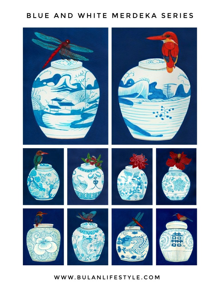 Chinese Blue and White Ginger Jars with Malaysian Wildlife on a dark blue background representing the starting point, and then on neon background representing the evolution. The Chinese blue and white porcelain jars, symbolizes the roots and heritage of the Chinese diaspora, the legacy of traditional Chinese culture, the porcelain jars stand as silent witnesses to the artist’s ancestral heritage. These jars represent the artist’s inherited aspects of Chinese traditions and history, serving as a foundation upon which the artist builds her personal identity. The jars are paired with vibrant Malaysian birds, dragonflies, and flowers, symbolizing the living and evolving fusion of cultures. These vibrant elements represent Malaysia. Through this imagery, the works portray the artist’s journey of embracing and integrating cultural influences.