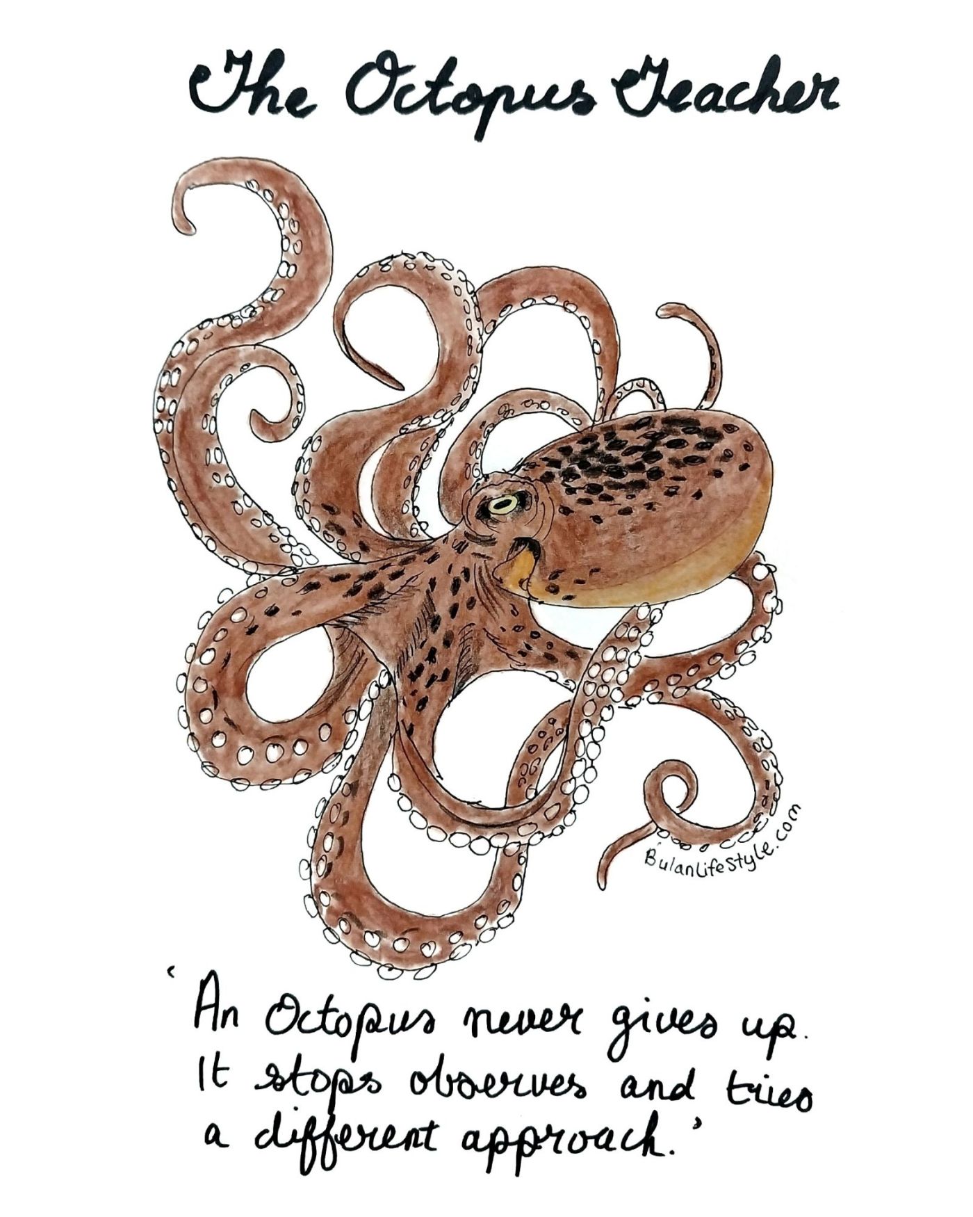 The octopus teacher Sketch of the day. The octopus teacher.Octopus are intelligent, resilient and adaptable.When presented with a challenge, an octopus never gives up, it stops, observes and tries a different approach. 🐙 Anyone watched the documentary?